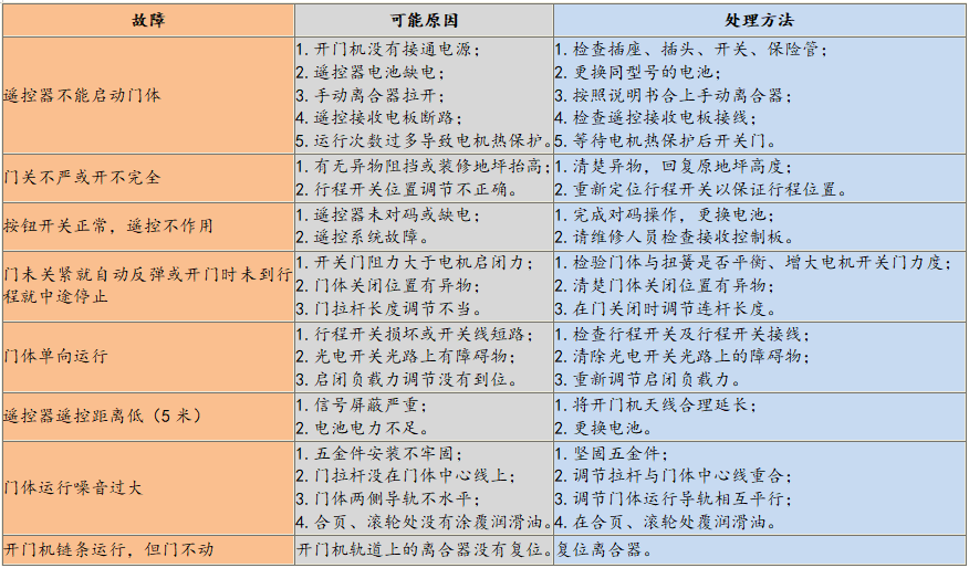 2、車庫門安裝時(shí)間久遠(yuǎn)后可能出現(xiàn)一些故障,常規(guī)故障及可能原因和處理方法如下: